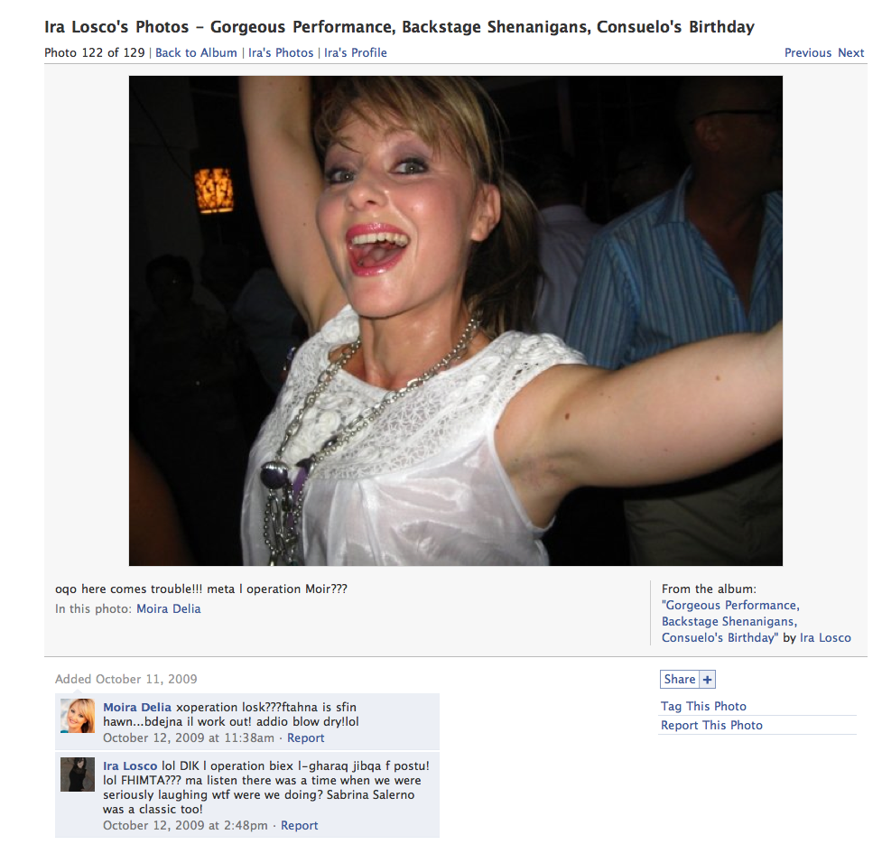 From Ira Losco’s Facebook album titled ‘Gorgeous performance, backstage shenanigans, Consuelo’s birthday’ – this picture is of ageing showgirl Moira Delia at what singer Ira Losco calls Consuelo’s birthday.