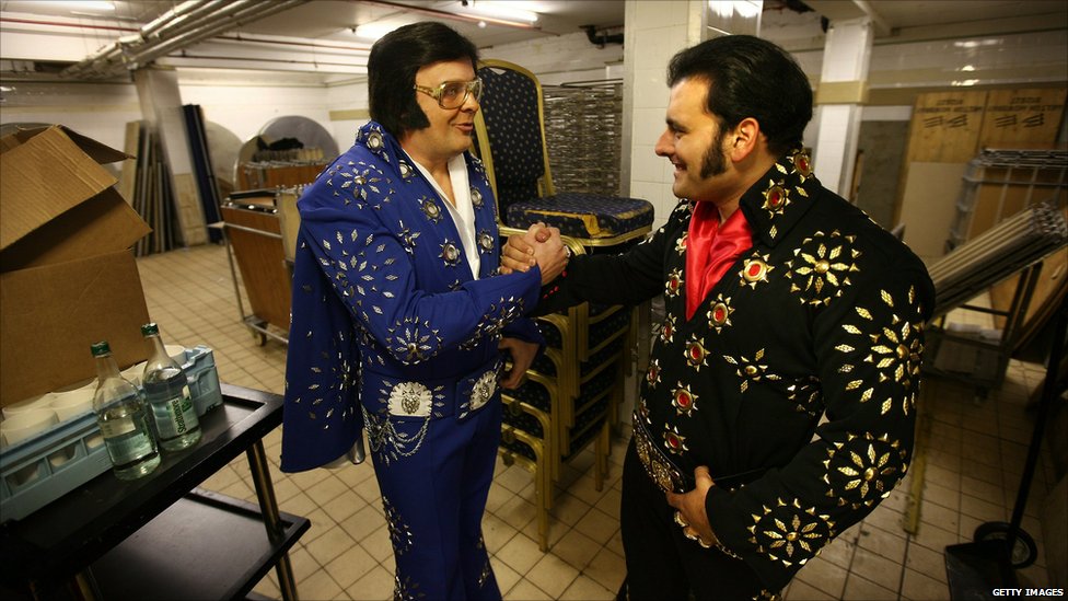 This picture was published on the BBC’s online world news – the Day in Pictures, 6 January – and captioned ‘A pair of Elvises, both from Malta, wish each other luck backstage before taking part in the European Elvis Championships, held in the UK city of Birmingham.’