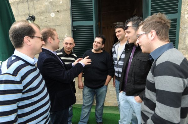 Joseph Muscat briefs hia excellent team of striped explorers before their descent into the world beneath the Hypogeum, to canvas for votes from white-haired humanoids.