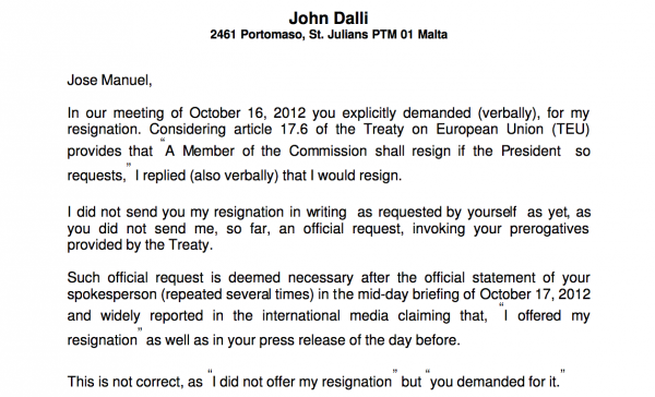 “In our meeting of October 16, 2012 you explicitly demanded (verbally) for my resignation. Considering article 17.6 of the TEU… I replied (also verbally) that I would resign. I did not resign you my resignation in writing as requested by yourself as you did not send me, so far, an official request, invoking your prerogatives as provided by the Treaty.
