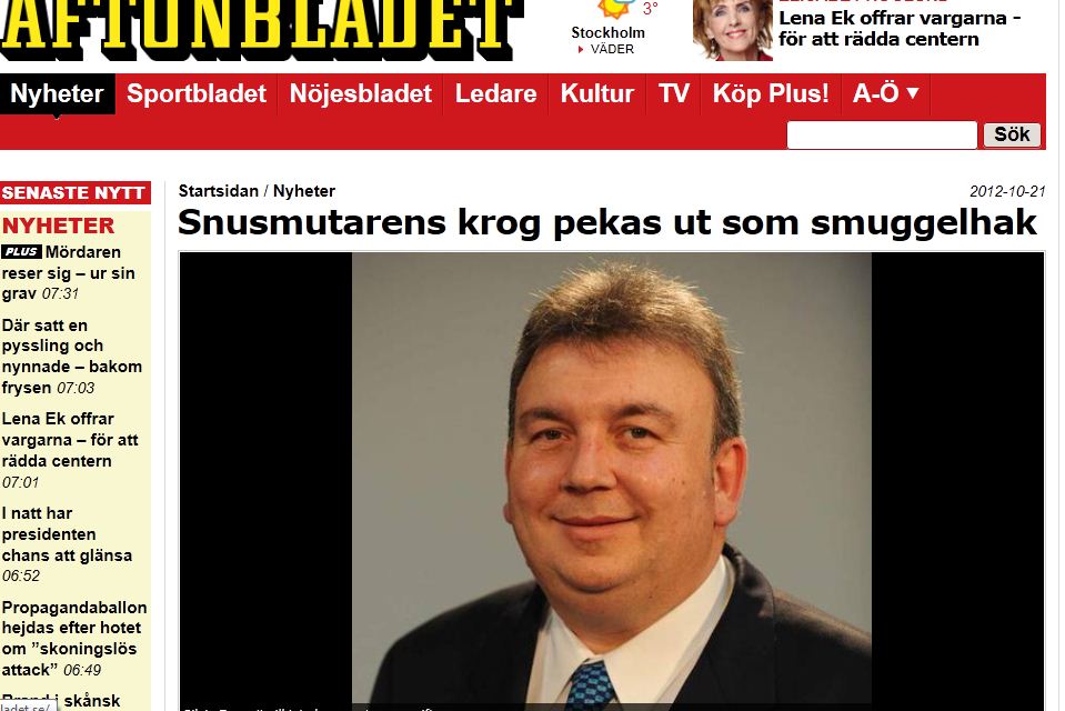 Unfortunately for Dalli, right beneath this video interview, the newspaper ran a story about his sidekick’s illicit snus activities, with the (Swedish) word for ‘snus smuggler’ in the headline.