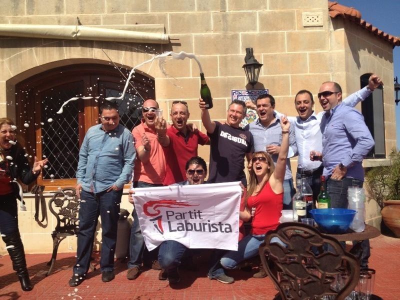 Matthew Pace is the one squatting and holding the Partit Laburista flag.