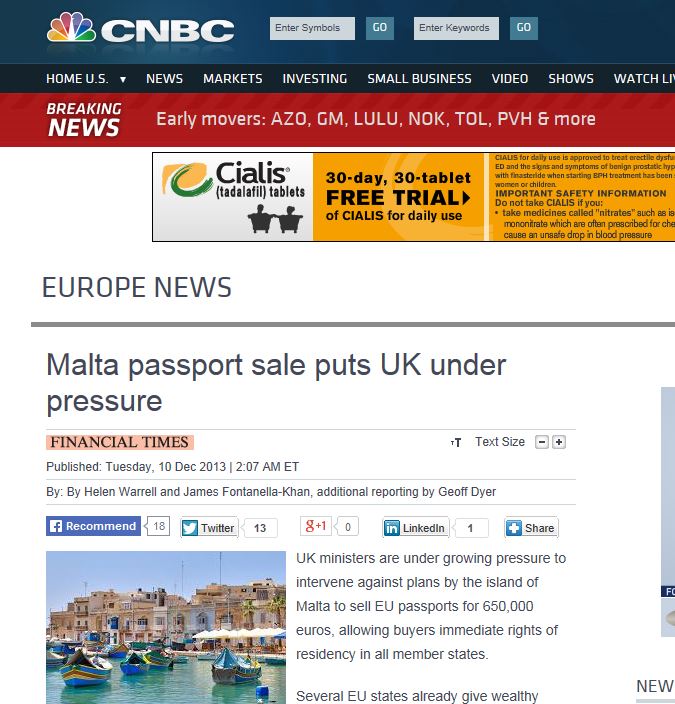 The Financial Times ‘Malta passports’ story has now been picked up by CNBC
