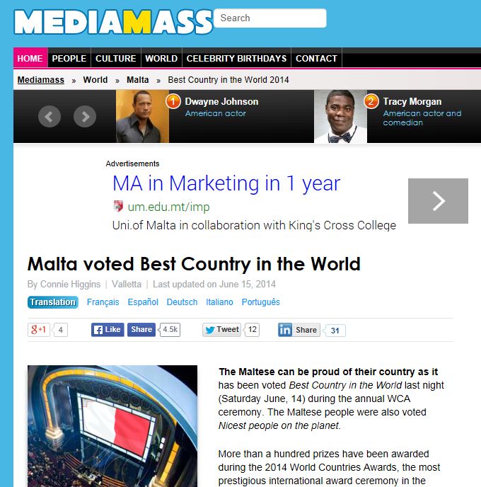 There’s a satirical piece called ‘Malta voted best country in the world’ on Media Mass, and an excited Manuel Cuschieri has uploaded the hot news on his Facebook Timeline together with many exclamation marks.