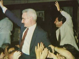 Karmenu Vella being carried shoulder-high with Prime Minister Karmenu Mifsud Bonnici, in whose early 1980s cabinet he was a minister